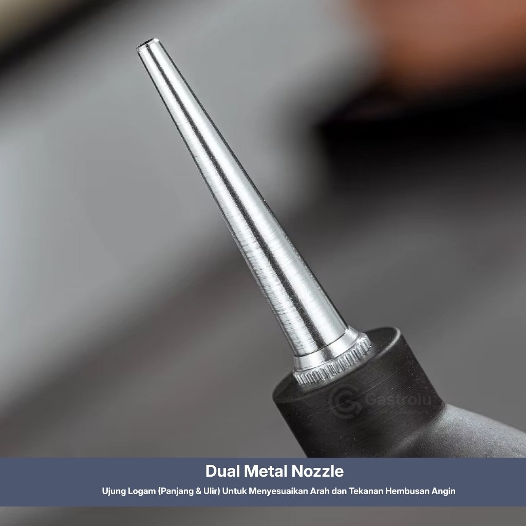 Dilengkapi dengan dua jenis nozzle logam yang dapat diganti sesuai kebutuhan. Nozzle panjang membantu menjangkau area sempit, sedangkan nozzle pendek memberikan hembusan udara yang lebih fokus.