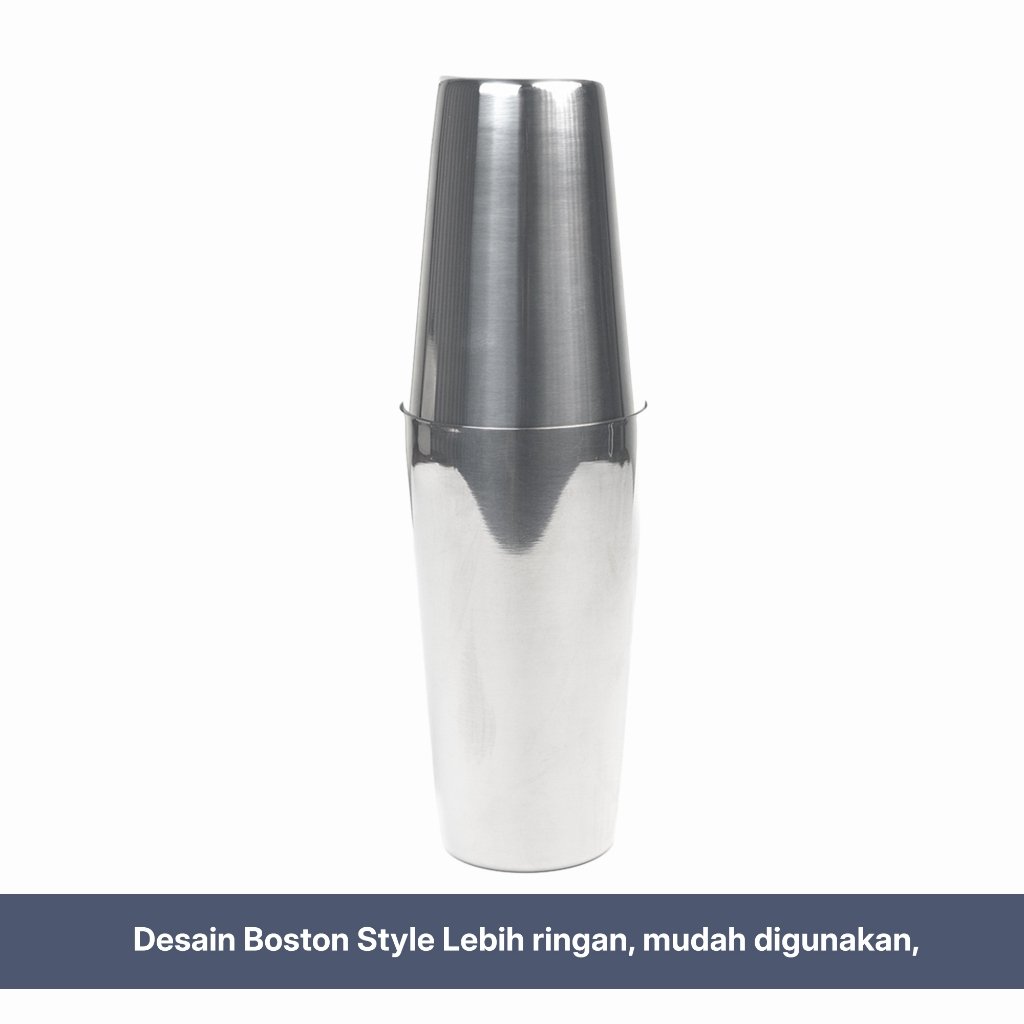 Material stainless steel memberikan kekuatan, ketahanan terhadap karat, serta aman digunakan untuk makanan dan minuman. Desain Boston style yang sederhana membuat alat ini menjadi standar yang banyak digunakan oleh bartender profesional di bar dan restoran.