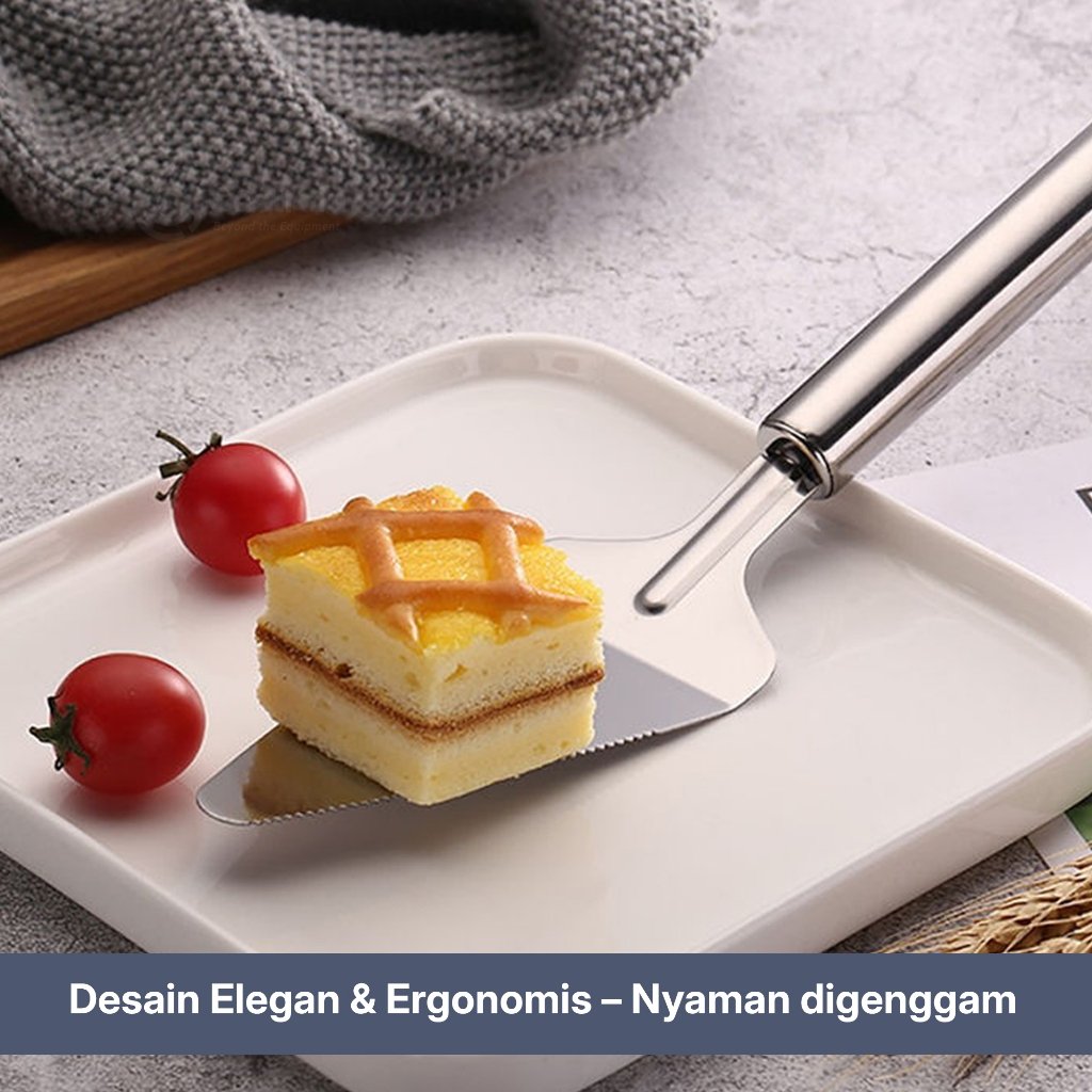 Cake server stainless steel adalah alat penyaji yang digunakan untuk memotong dan mengambil potongan kue dengan rapi. Desainnya memadukan fungsi pisau dan sendok sehingga memudahkan proses memotong sekaligus menyajikan kue dalam satu alat.