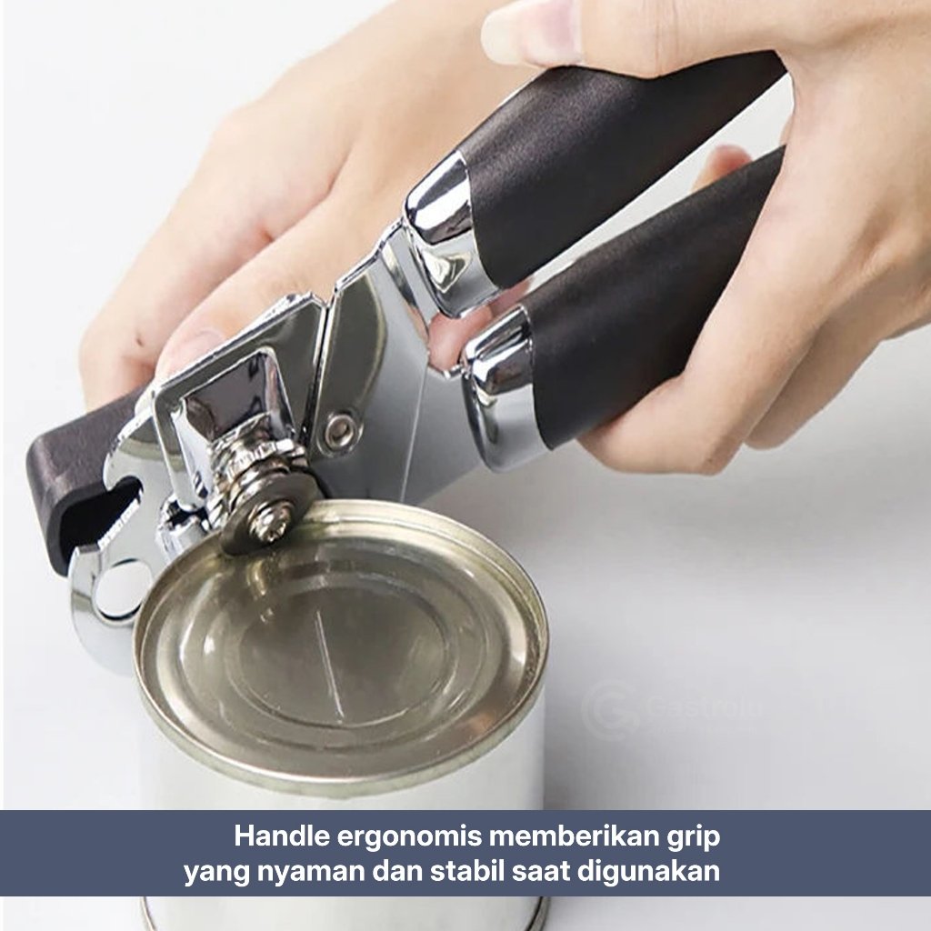 Material stainless steel memberikan kekuatan dan ketahanan terhadap karat sehingga cocok digunakan untuk penggunaan jangka panjang. Pegangan ergonomis dengan lapisan anti slip memberikan kontrol yang lebih stabil saat membuka kaleng.