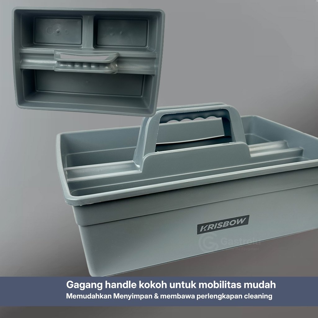 Cleaning Caddy Box Plastik dengan Handle adalah kotak perlengkapan serbaguna yang dirancang untuk memudahkan penyimpanan dan membawa alat kebersihan. Cocok digunakan di café, restoran, hotel, kantor, maupun keperluan rumah tangga.