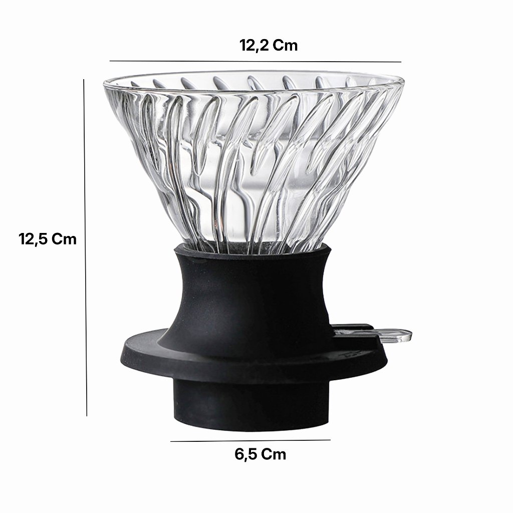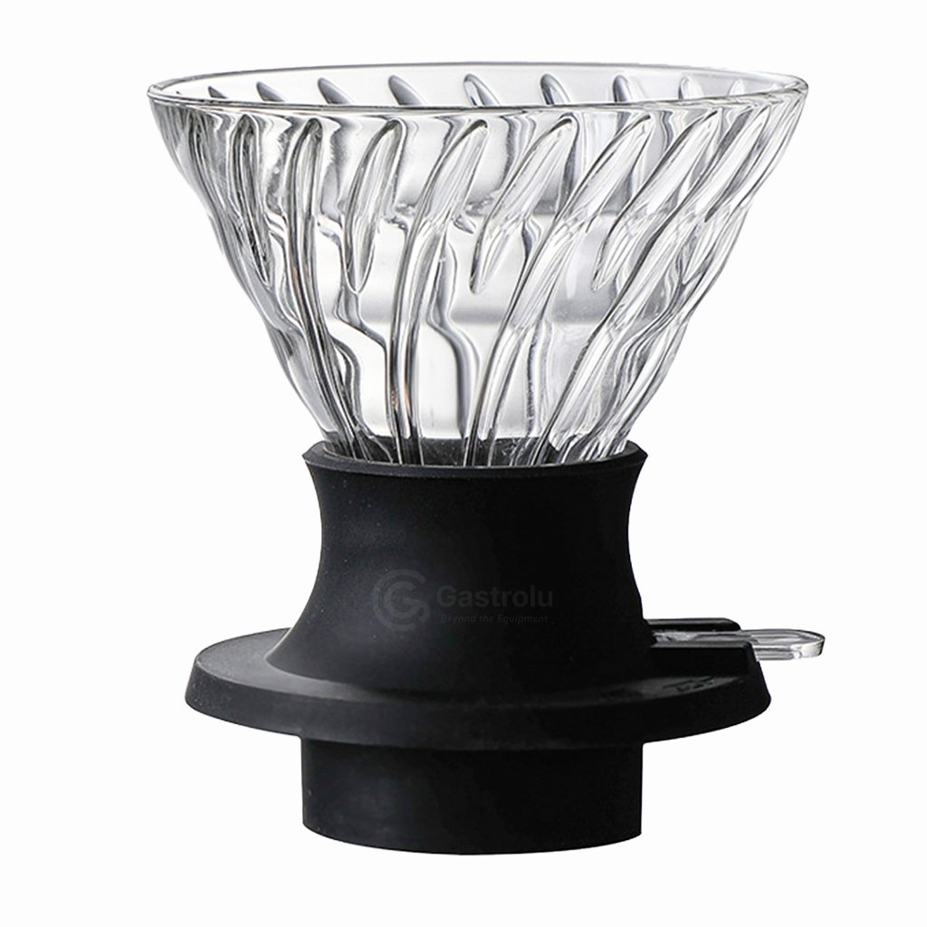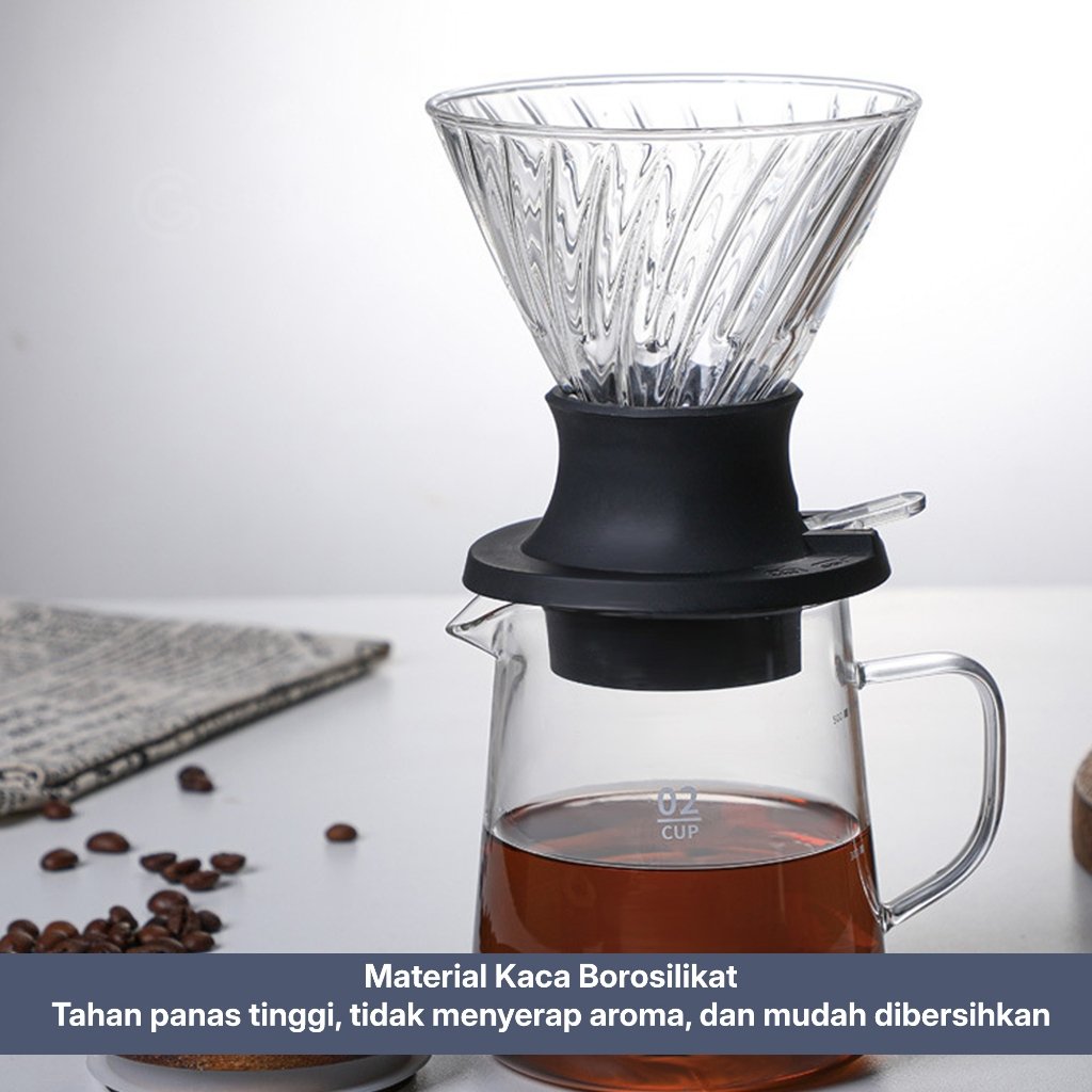 Dilengkapi dengan dudukan silikon anti slip yang membantu menjaga stabilitas dripper saat digunakan di atas server atau cangkir. Material kaca transparan juga memberikan tampilan yang elegan dan sering digunakan oleh barista untuk proses brewing manual.