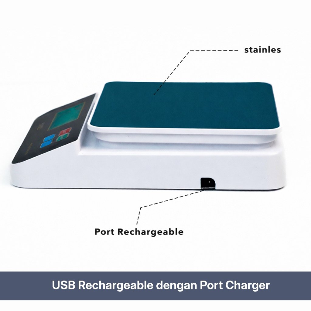 Timbangan ini menggunakan sistem rechargeable melalui USB sehingga lebih praktis tanpa perlu mengganti baterai. Layar LED digital memberikan tampilan angka yang jelas dan mudah dibaca dalam berbagai kondisi pencahayaan.