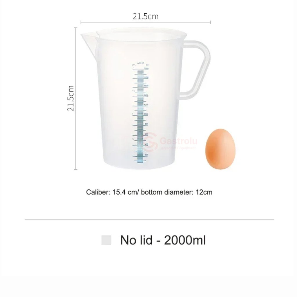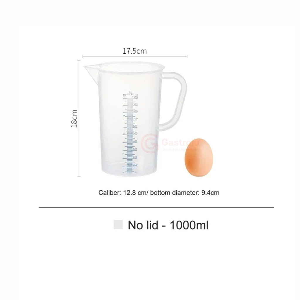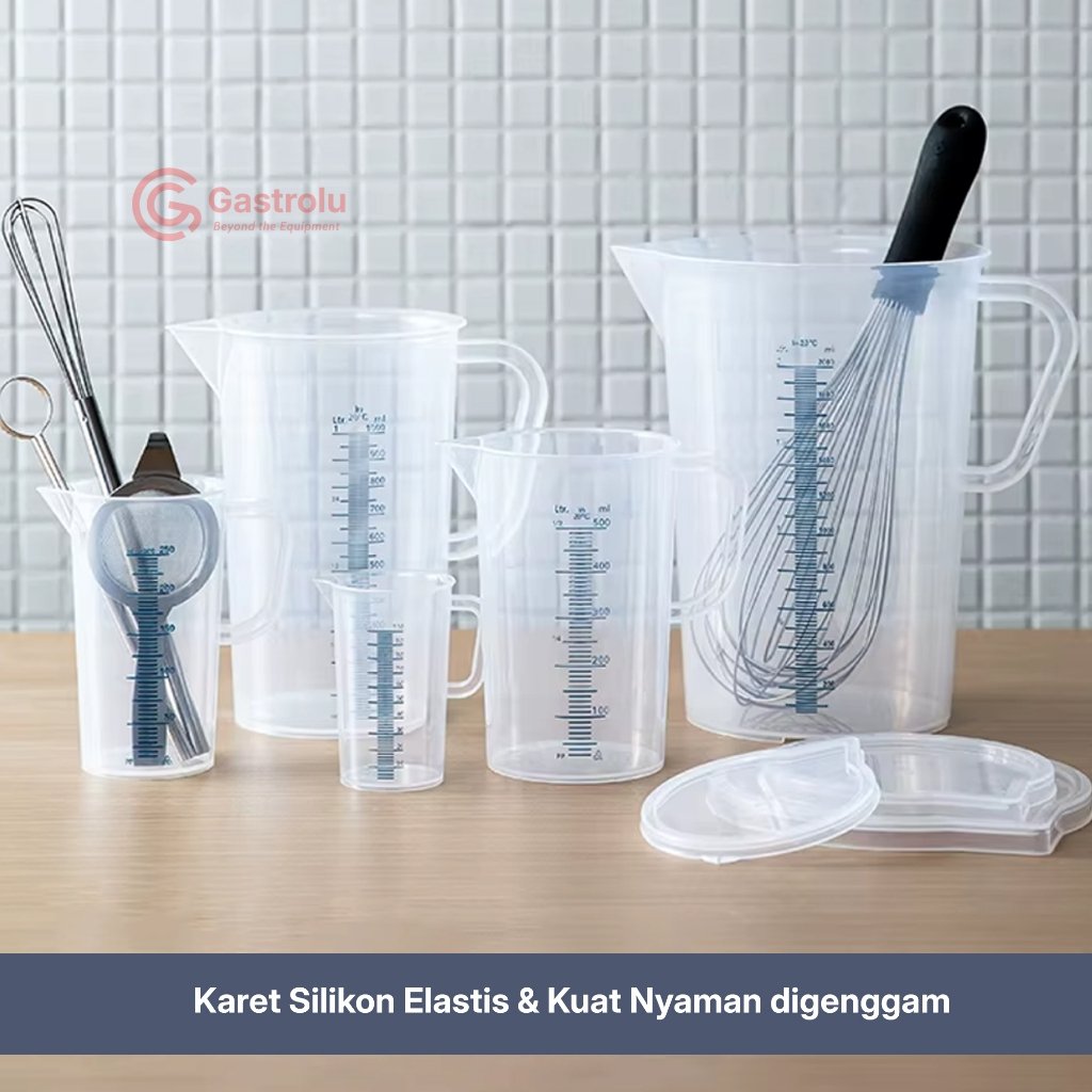 Gelas ukur berbahan plastik transparan dengan skala takaran yang jelas dan mudah dibaca, dirancang untuk kebutuhan pengukuran cairan dan bahan masak secara akurat di dapur, bar, cafe, dan area food preparation.