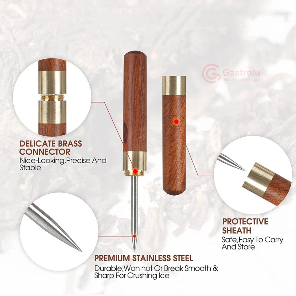 Hadir dengan desain klasik dan kokoh, Ice Pick ini terbuat dari bahan stainless steel berkualitas tinggi untuk bagian ujung tajam, dipadukan dengan gagang kayu solid serta aksen brass (kuningan) pada ulir dan leher — menghasilkan perpaduan estetika dan kekuatan yang ideal untuk bartender, penikmat whiskey, maupun pecinta es kristal handmade.
