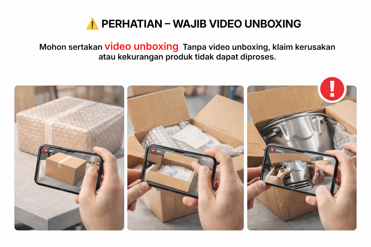 Wajib menyertakan video unboxing penuh sejak paket masih tertutup sampai produk diperiksa.