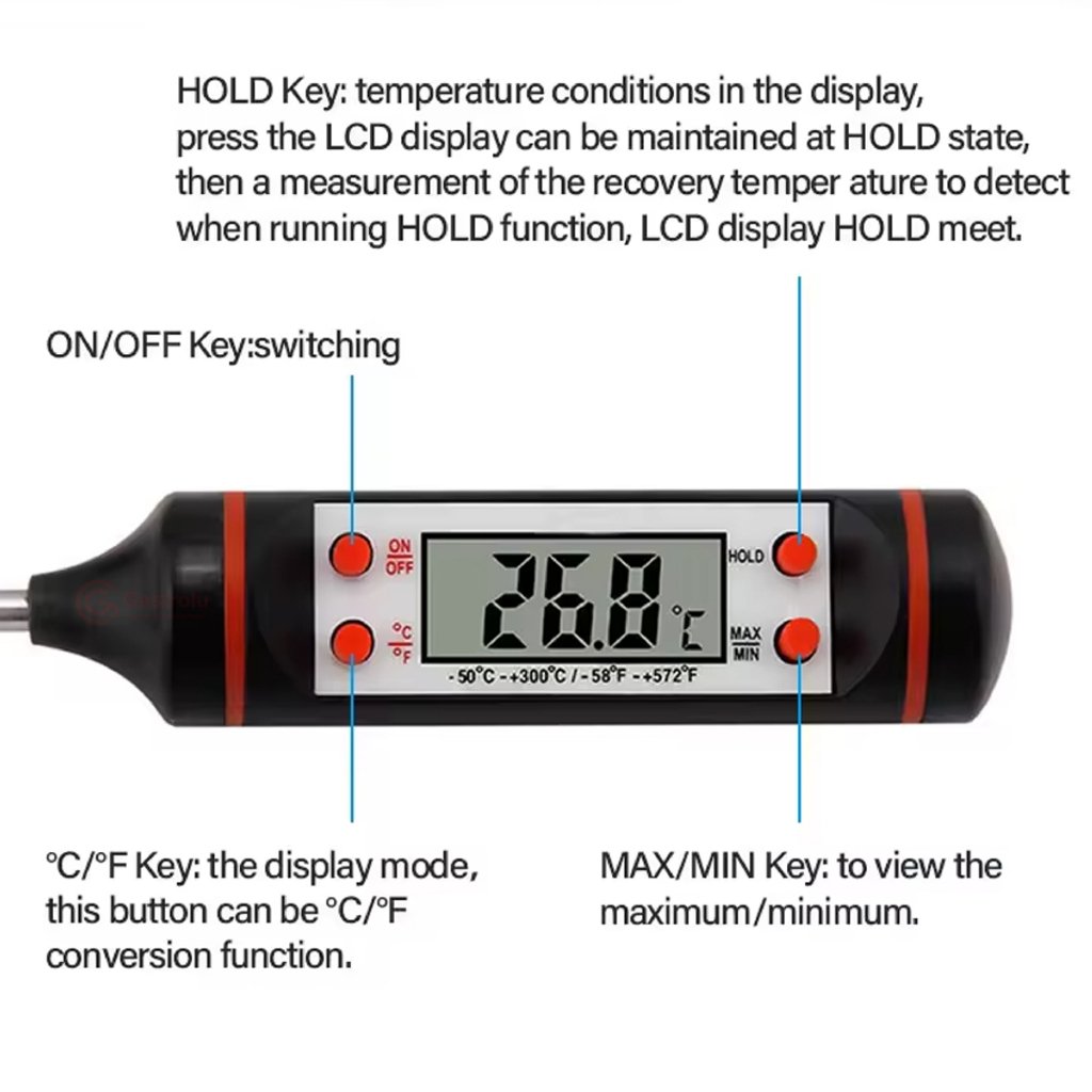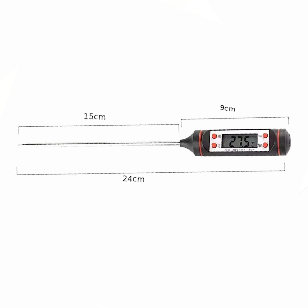 Dilengkapi dengan layar LCD digital yang menampilkan suhu hanya dalam beberapa detik sehingga mudah dibaca saat digunakan. Probe stainless steel panjang memungkinkan pengukuran suhu internal makanan, cairan, susu, kopi, hingga daging dengan lebih presisi.