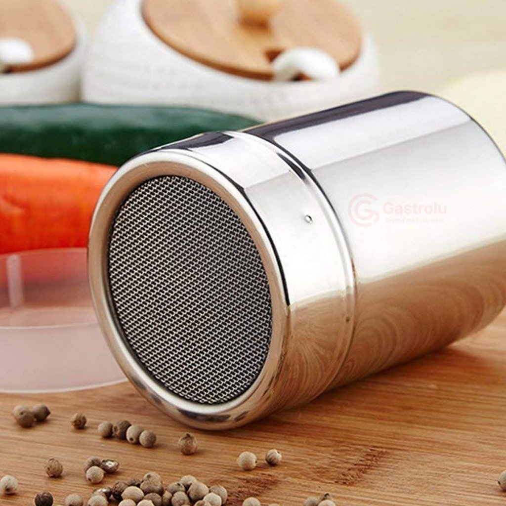 Mesh Shaker berbahan stainless steel yang dirancang khusus untuk menaburkan bubuk coklat, cacao, kayu manis, atau bubuk topping lainnya secara merata dan presisi pada minuman maupun dessert.
