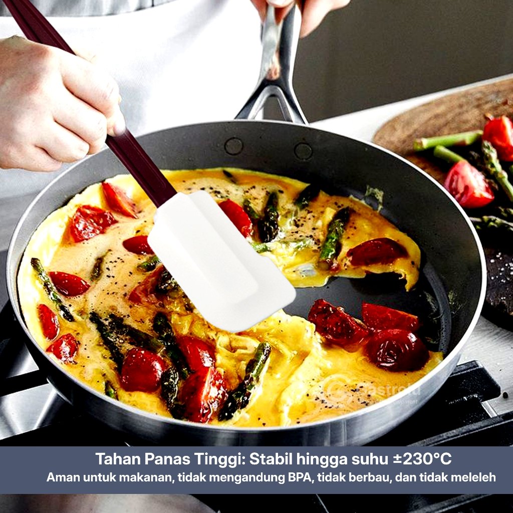 Spatula silikon anti panas dirancang untuk membantu berbagai aktivitas memasak seperti menumis, mengaduk saus, membalik makanan, hingga mencampur adonan. Alat ini cocok digunakan di dapur rumah maupun dapur profesional seperti café, restoran, dan usaha kuliner.