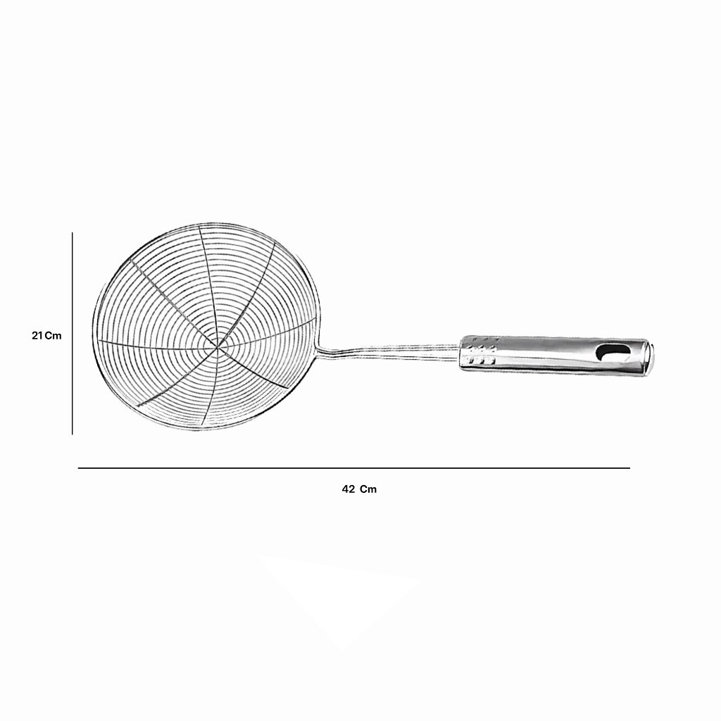 Dengan desain mesh saringan halus, alat ini mampu meniriskan minyak berlebih sekaligus menyaring serpihan kecil dari makanan saat proses memasak.