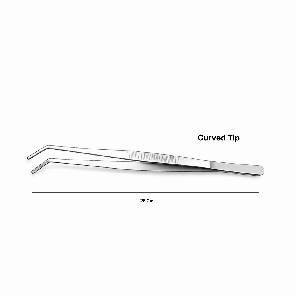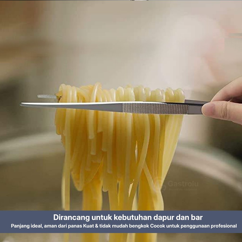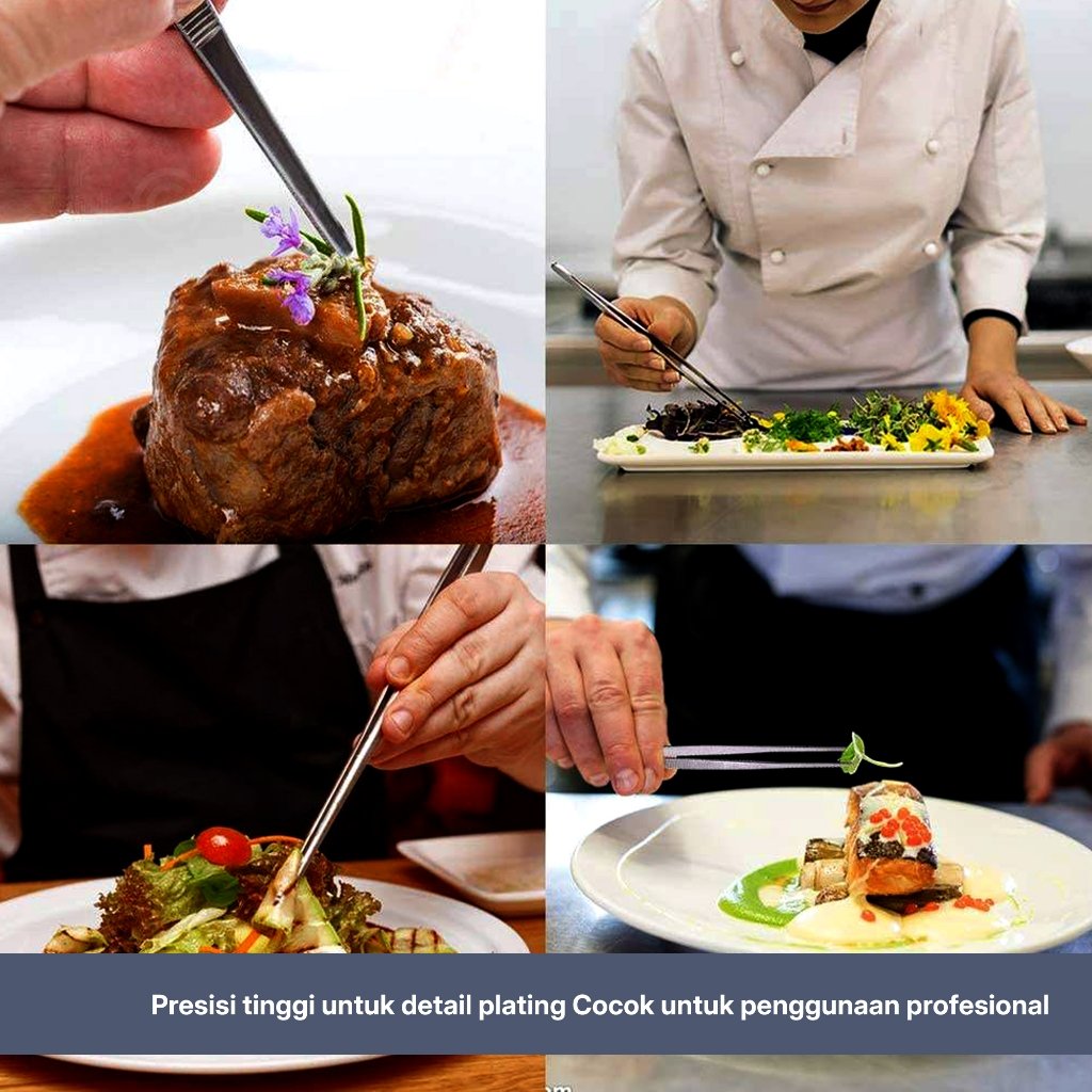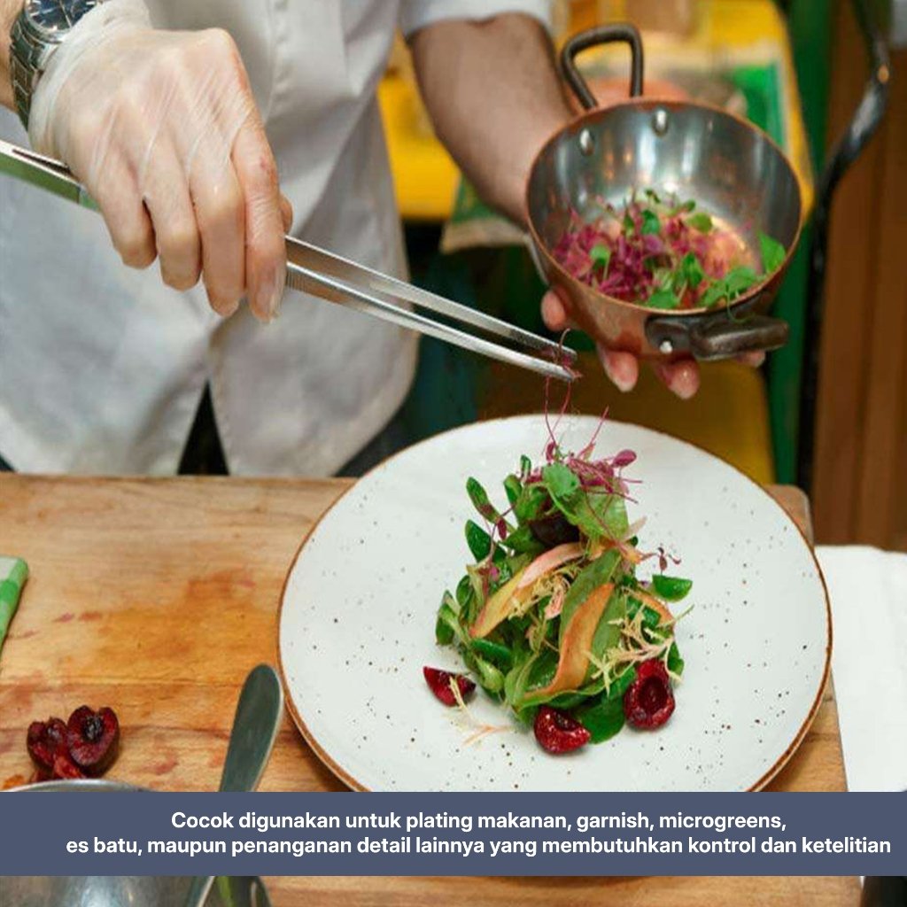 Pinset stainless steel profesional dengan panjang 25 cm, dirancang untuk kebutuhan dapur dan bar dengan tingkat presisi tinggi. Cocok digunakan untuk plating makanan, garnish, microgreens, es batu, maupun penanganan detail lainnya yang membutuhkan kontrol dan ketelitian.