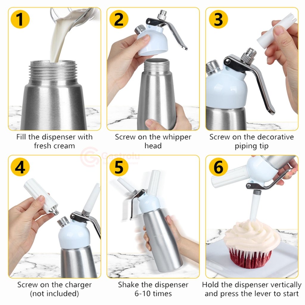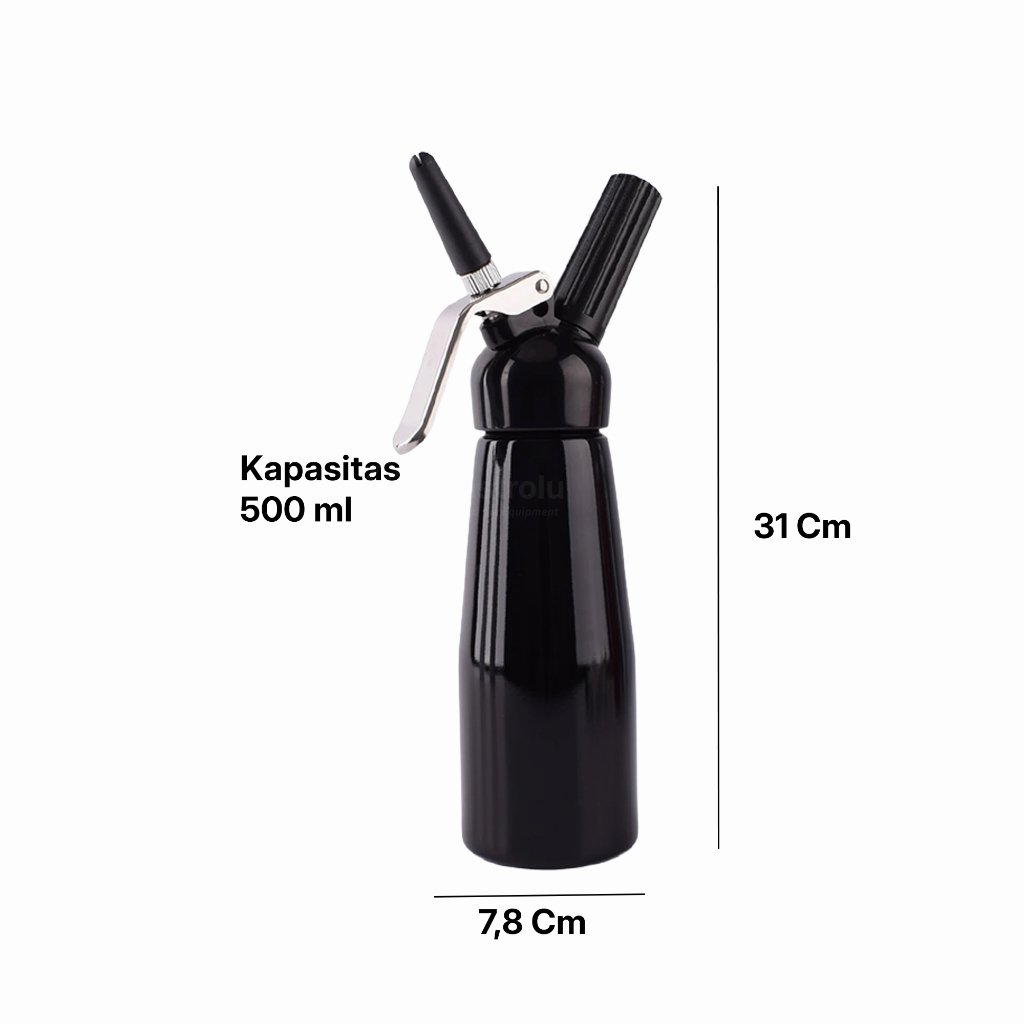 Dengan kapasitas 500 ml, alat ini cocok digunakan untuk berbagai kebutuhan seperti topping minuman kopi, dessert, kue, pancake, maupun hidangan manis lainnya. Sistem dispenser membantu menghasilkan krim dengan bentuk yang rapi dan konsisten.